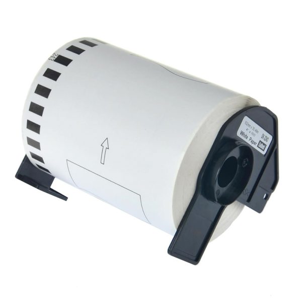 Cinta Brother Dk-2243 negro sobre blanco Compatible, con 4 pulgadas de ancho x 100 pies de largo (102mm x 30.48m), imprime, corta y despega etiquetas de cualquier tamaño como desees. No más espacio desperdiciado.