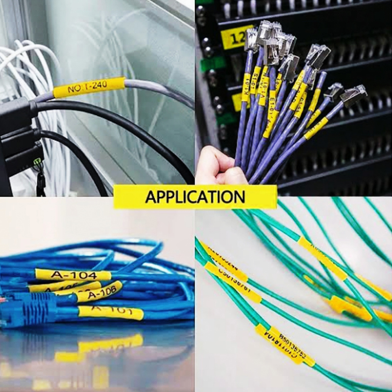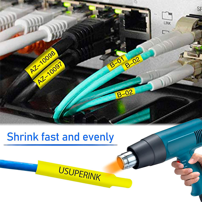 tubo termorretráctil imprimible diseñado para marcar cables, fibra y cables, ideal para uso en interiores o exteriores Puede ser ampliamente utilizado en conexión de cables, tratamiento de extremos de alambre, protección de juntas de soldadura, identificación de mazos de cables, protección de aislamiento de resistencia y capacitancia, protección contra la corrosión de varillas o tuberías metálicas.