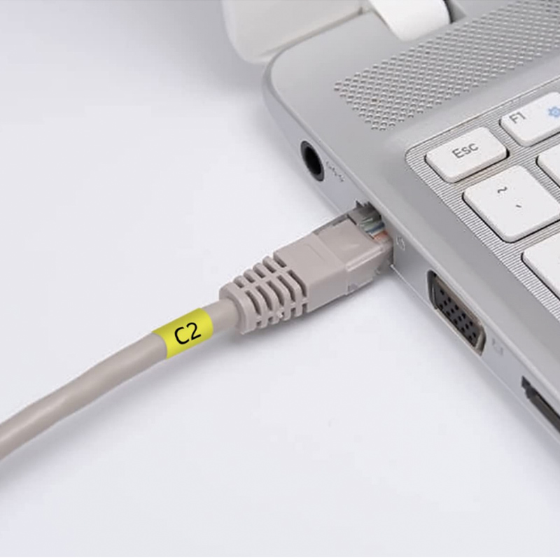 Después de imprimir las etiquetas, utiliza aire caliente (como un secador de pelo) para pegar completamente las etiquetas a los cables.