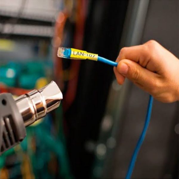 Después de imprimir las etiquetas, utiliza aire caliente (como un secador de pelo) para pegar completamente las etiquetas a los cables.
