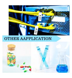 Se pueden utilizar para aplicaciones en interiores y exteriores, adecuada para el hogar, oficina, escuela, industria de Telecomunicaciones, almacén, laboratorio de química, hotel, para etiquetar cocina, estanterías, gabinetes de suministros, en congeladores, microondas, lavavajillas, hospital y etiquetado de condimentos, archivos, carpetas, estantes y libros. Utilizadas para un etiquetado general en superficies lisas y planas, crean etiquetas claramente legibles por mucho tiempo.