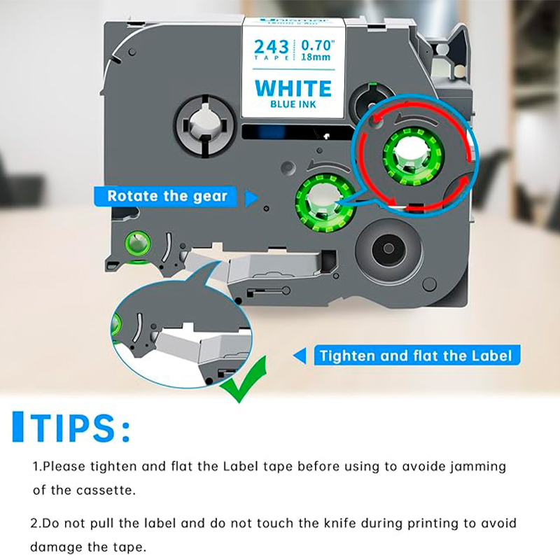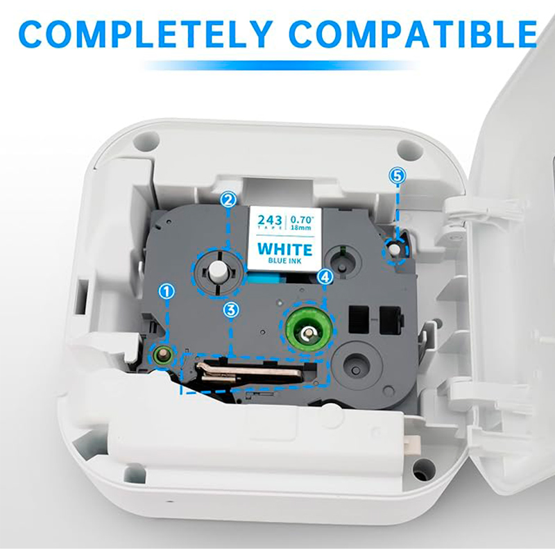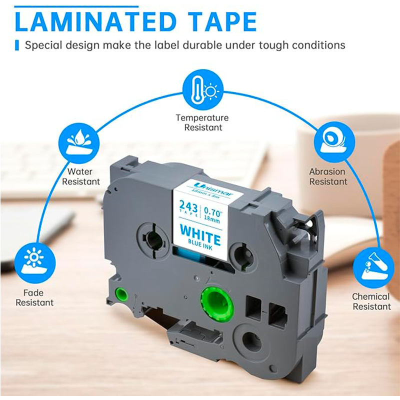 Las Cinta Brother Tze-243 Tz2-243 18mm x 8mts, Compatible Nuevo Letra azul sobre blanco, están diseñadas para durar incluso bajo condiciones extremas y son capaces de aguantar temperaturas extremas, luz solar, agua, sustancias químicas o la abrasión.