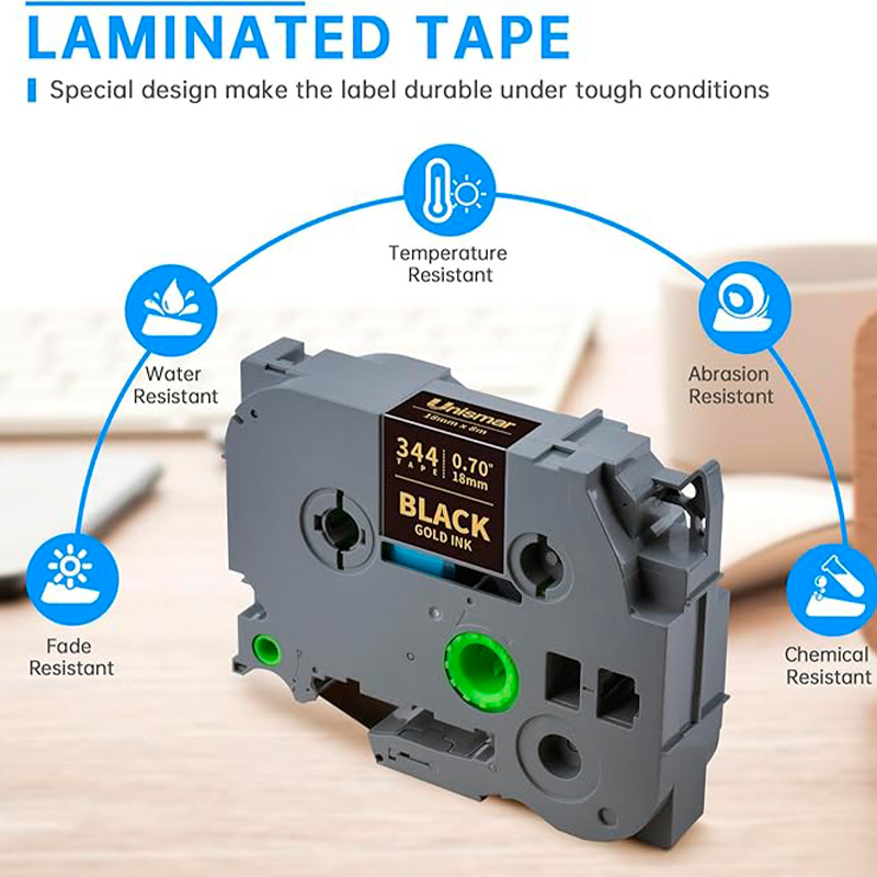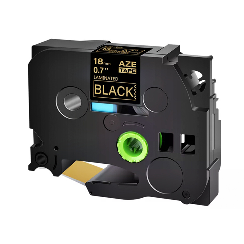 Las Cinta Brother Tze-344 Tze-344 18mm x 8mts, Compatible Nuevo Letra dorada sobre fondo negro, están diseñadas para durar incluso bajo condiciones extremas y son capaces de aguantar temperaturas extremas, luz solar, agua, sustancias químicas o la abrasión.