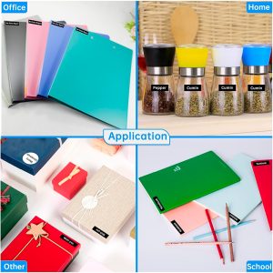 Se pueden utilizar para aplicaciones en interiores y exteriores, adecuada para el hogar, oficina, escuela, industria de Telecomunicaciones, almacén, laboratorio de química, hotel, para etiquetar cocina, estanterías, gabinetes de suministros, en congeladores, microondas, lavavajillas, hospital y etiquetado de condimentos, archivos, carpetas, estantes y libros. Utilizadas para un etiquetado general en superficies lisas y planas, crean etiquetas claramente legibles por mucho tiempo.