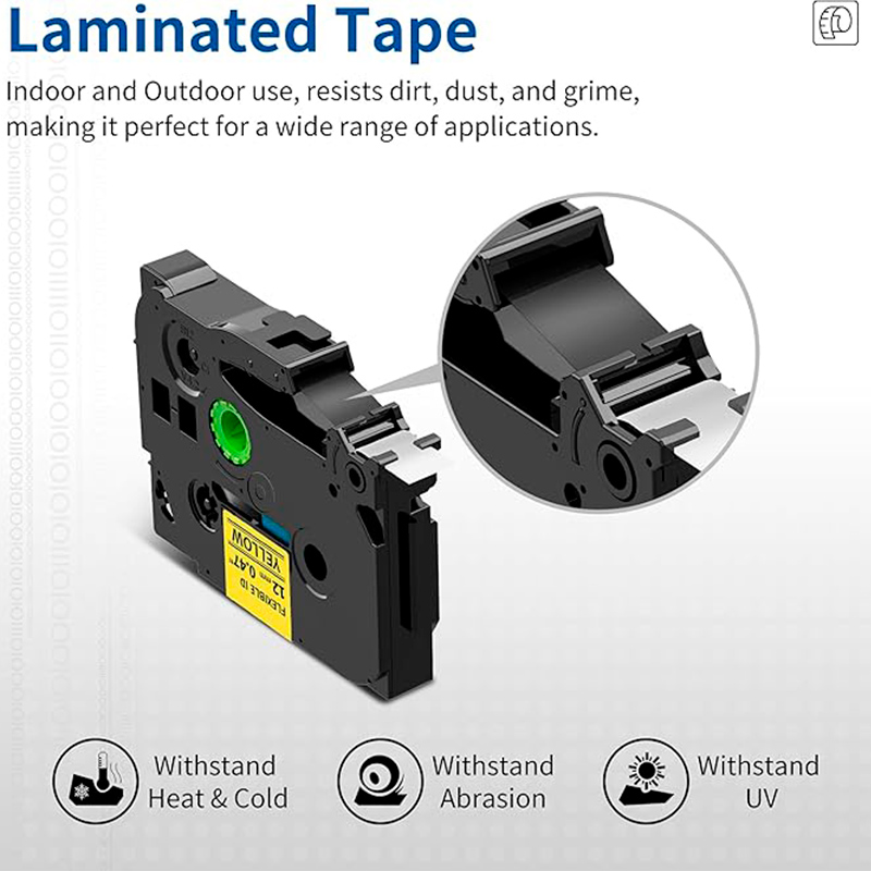 Cinta Brother Tze-FX631 Tz2-FX631 flexible Laminada Letra negra sobre Amarillo, están diseñadas para durar, incluso bajo condiciones extremas y son capaces de aguantar temperaturas extremas, luz solar, agua, sustancias químicas o la abrasión.