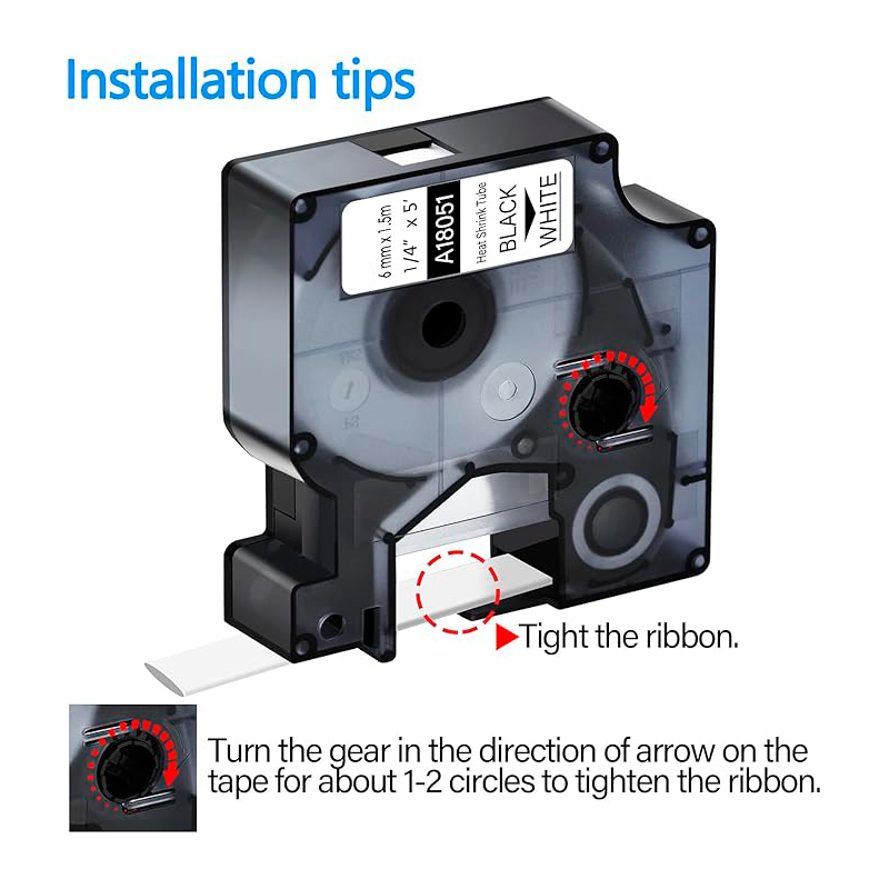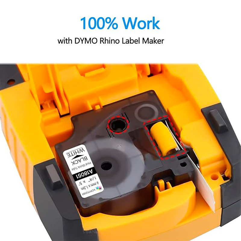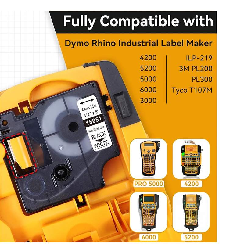 Cinta Dymo 18051 6mm X 1.5Mts. termocontraible Letra negra sobre blanco Compatible, perfecto para marcar cables, fibras y alambres. Adhesivo de resistencia industrial resistente a la humedad, temperaturas extremas y resistente al agua, anticorrosión, anti-UV, resistente a los productos químicos, resistente a la grasa, resistente al aceite, persistente y resistente a la decoloración