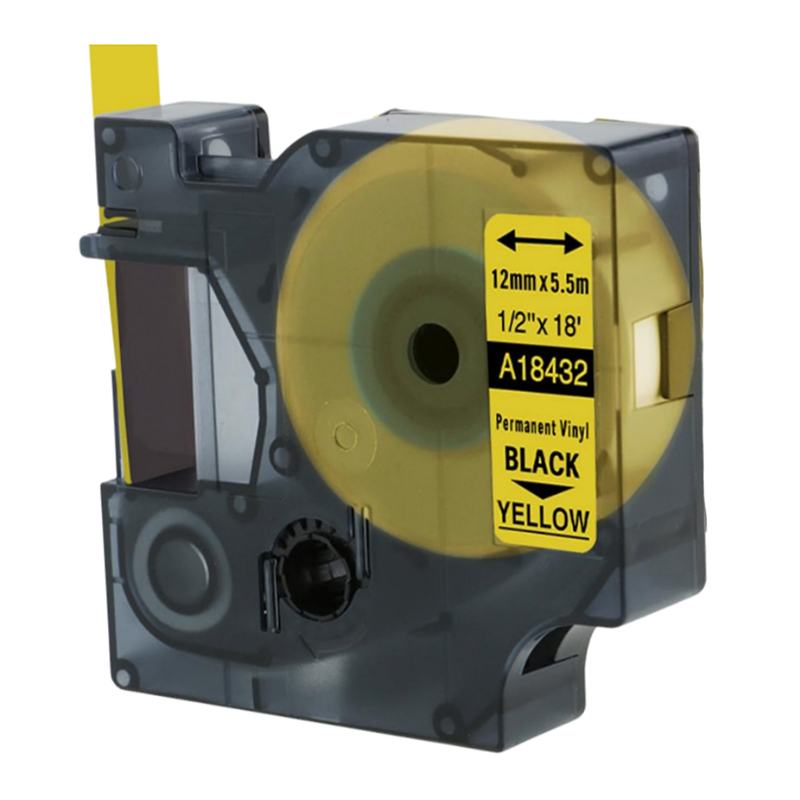 Cinta Dymo 18432 12mm X 5.5Mts. Vinyl adhesivo Letra negra sobre Amarillo, es adhesivo de resistencia industrial, resiste la humedad, temperaturas extremas, luz UV y más, por lo que las etiquetas no se enrollan ni se caen, para adaptarse a todo, desde paneles de conexión y cables hasta contenedores, vigas y mucho más.