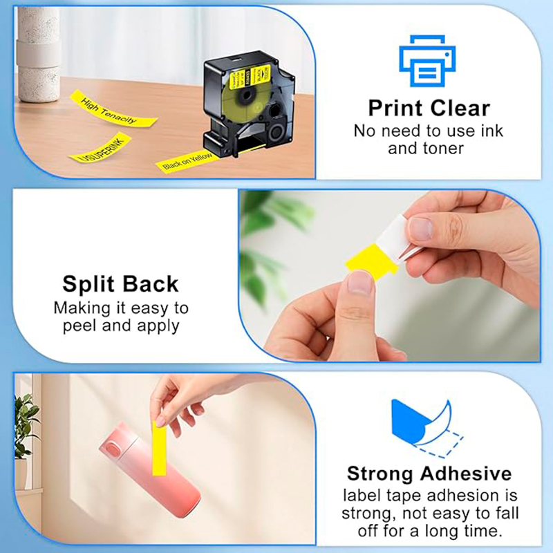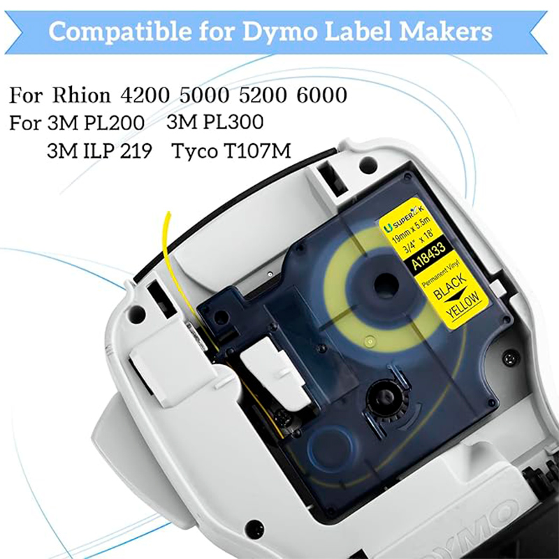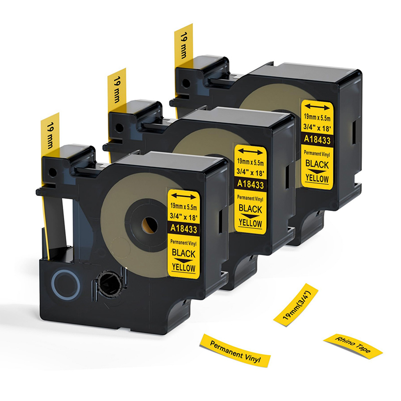 Cinta Dymo 18433 19mm X 5.5mts. Vinyl adhesivo Letra negra sobre Amarillo, es adhesivo de resistencia industrial, resiste la humedad, temperaturas extremas, luz UV y más, por lo que las etiquetas no se enrollan ni se caen, para adaptarse a todo, desde paneles de conexión y cables hasta contenedores, vigas y mucho más.