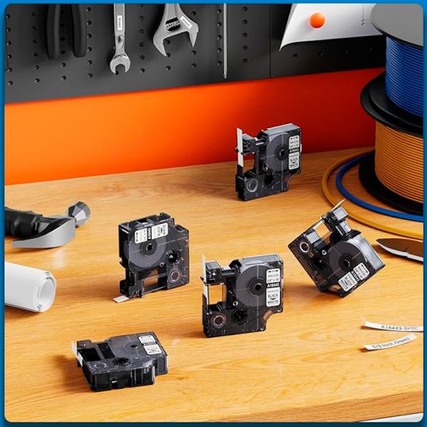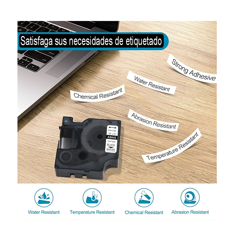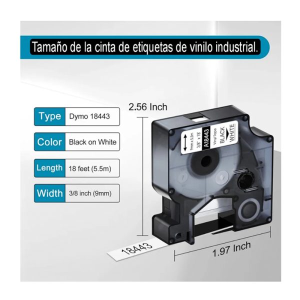 Cinta Dymo 18443 9mmX5.5Mts. Vinyl adhesivo Letra negra sobre blanco, es adhesivo de resistencia industrial, resiste la humedad, temperaturas extremas, luz UV y más, por lo que las etiquetas no se enrollan ni se caen, para adaptarse a todo, desde paneles de conexión y cables hasta contenedores, vigas y mucho más.